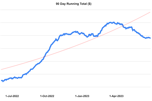 The rate of growth when we switched to this model couldn't be clearer than in the 90-day running total graph (above).