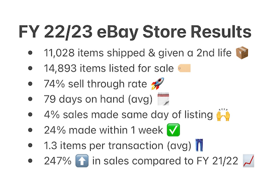 For the financial year, we rehomed 11,028 pieces of clothing (maybe 20-30 were other random products) and helped give them a second chance at life in a new wardrobe.